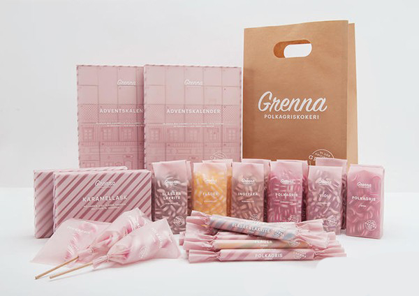 瑞典小镇格兰纳是红白相间的拐杖形薄荷糖的故乡,设计团队 Brobygrafiska 最近为当地糖果公司 Grenna Polkagriskokeri 重新设计了一套包装。通透的淡粉色外壳配以简洁的白色文字看起来非常清爽,不会给人造成太过甜腻的感觉。