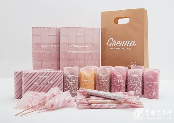 瑞典小镇格兰纳是红白相间的拐杖形薄荷糖的故乡,设计团队 Brobygrafiska 最近为当地糖果公司 Grenna Polkagriskokeri 重新设计了一套包装。通透的淡粉色外壳配以简洁的白色文字看起来非常清爽,不会给人造成太过甜腻的感觉。